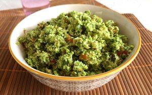 - En un bowl grande, combina el brócoli y el coliflor procesados con el perejil, la menta, la albahaca y el ciboulette, todos finamente picados. Añade las olivas negras, las pasas de uva, los tomates secos picados y las almendras tostadas.