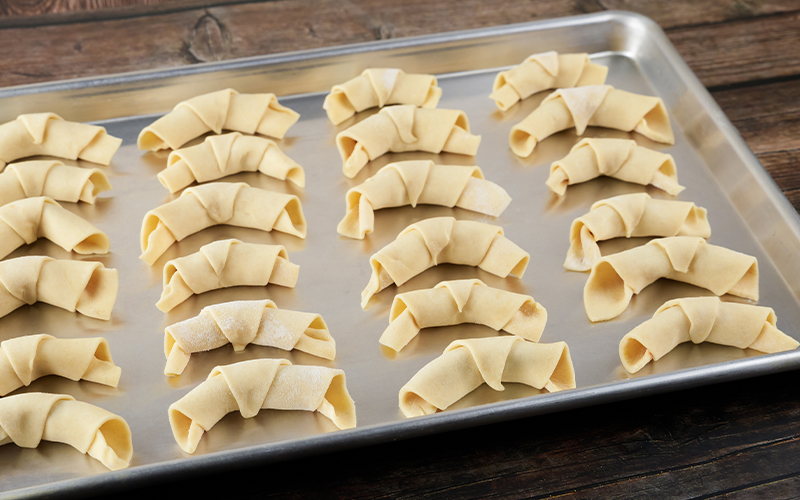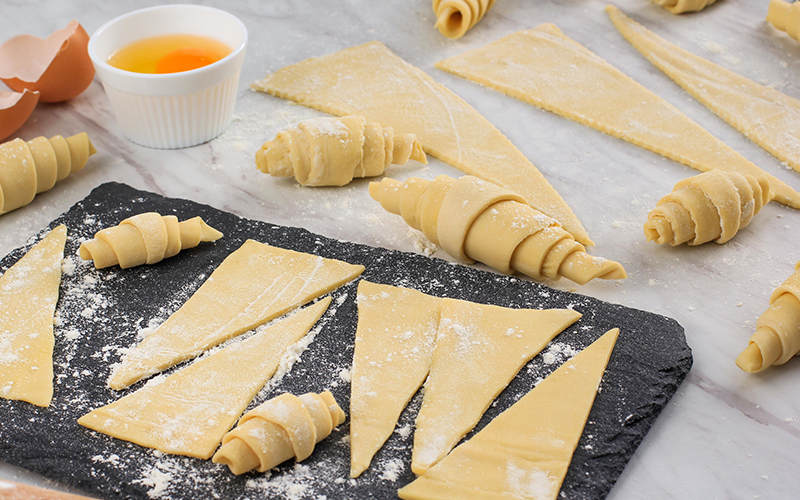 - Corta la masa en triángulos, enrolla para formar los croissants y colócalos en una bandeja para hornear. Deja leudar nuevamente durante 30-40 minutos.