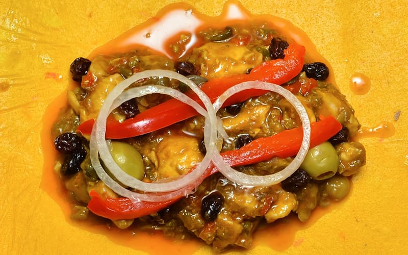 Agrega guiso, aceitunas, pasas, cebolla, pimentón y pollo desmechado.