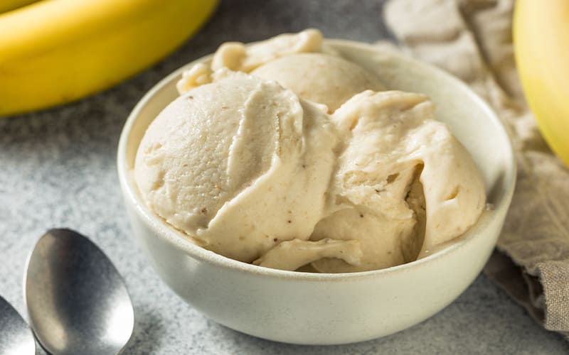 - Luego procesalos juntos con la esencia de vainilla hasta lograr una textura cremosa tipo helado. Si quieres, puedes sumarle coco o chips de chocolate.