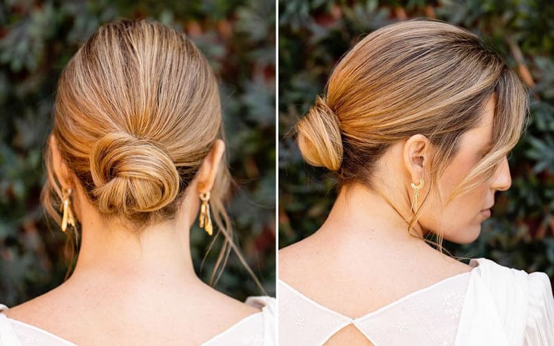 El moño “effortless” bajo es el favorito del momento: un recogido inspirado en el clásico moño italiano, pero con un toque más relajado. Su acabado ligeramente desordenado aporta sofisticación sin rigidez y mantiene un aire pulido, natural y muy favorecedor. Funciona tan bien porque no tira del cuero cabelludo, resiste horas y no exige retoques. Para lograrlo, peina la raíz con suavidad, enrolla el cabello hacia la nuca, sujétalo con horquillas y libera algunos mechones para enmarcar el rostro. Es ideal para cenas familiares o celebraciones elegantes, aunque también luce perfecto en eventos informales.