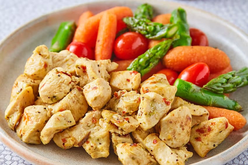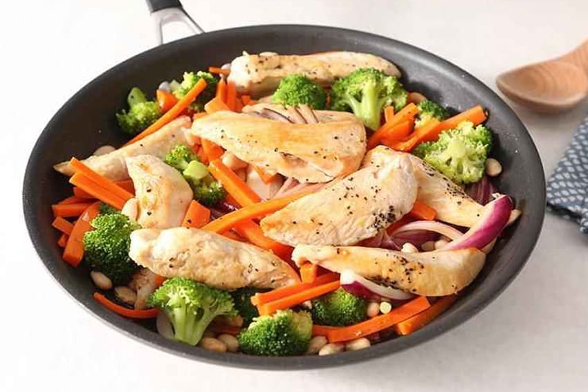 Calentar una sartén amplia con aceite de oliva y dorar el pollo de ambos lados hasta que esté bien cocido. Retirar y reservar.