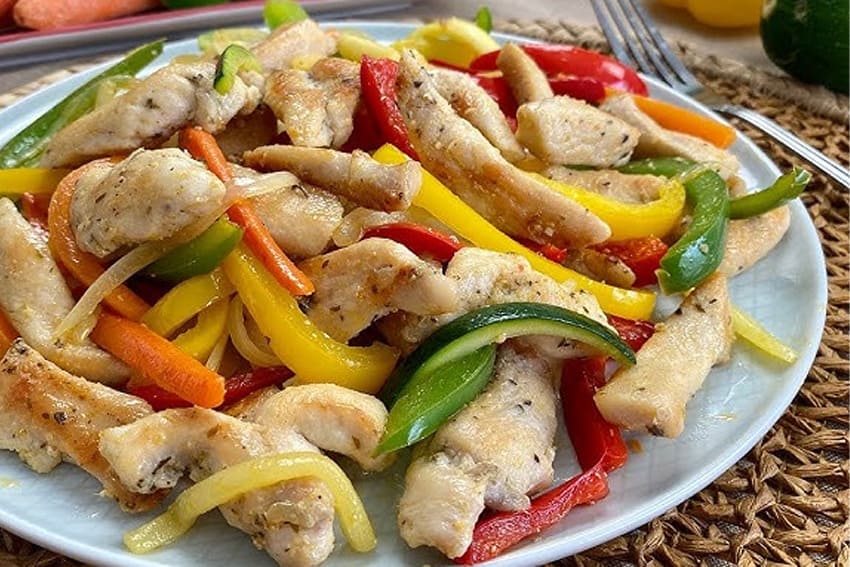 Cortar las pechugas en filetes medianos y condimentar con sal, pimienta, ajo y jugo de limón. Dejar marinar durante 20 minutos.